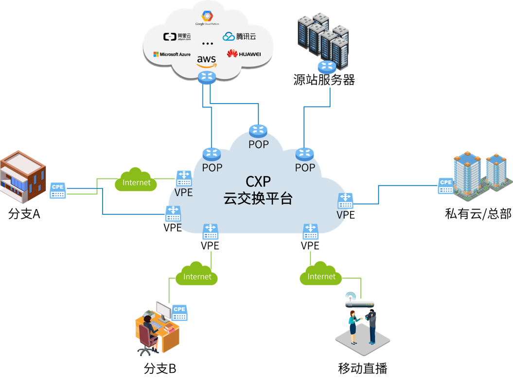 基于云交換平臺(tái)和智能接入終端快速實(shí)現(xiàn)企業(yè)用戶在數(shù)據(jù)中心、云環(huán)境、分支機(jī)構(gòu)和其他遠(yuǎn)程位置之間端到端數(shù)據(jù)互通、多點(diǎn)組網(wǎng)、混合云,可統(tǒng)一管理、降低交付成本,快速實(shí)現(xiàn)業(yè)務(wù)上線。